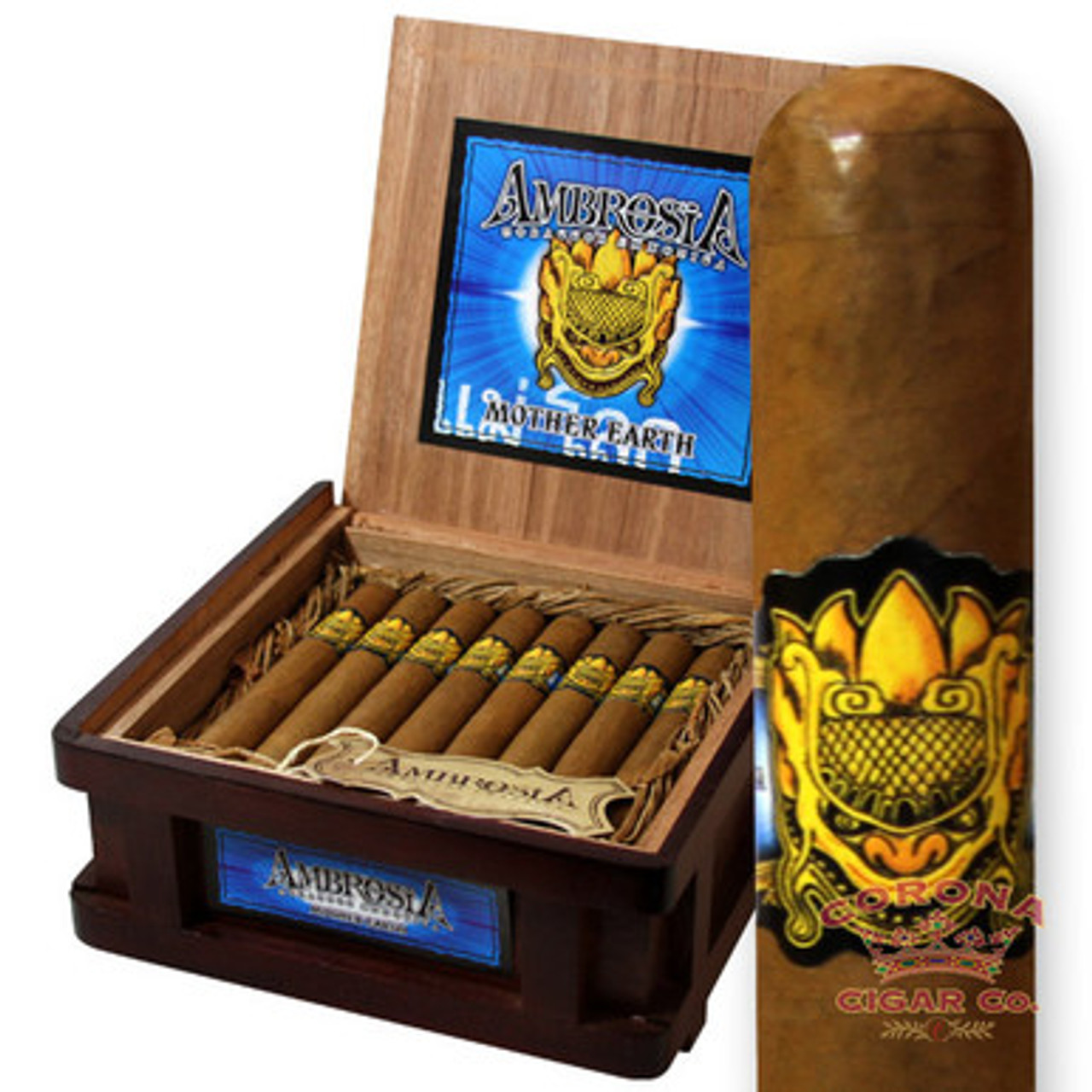 The Ambrosia Mother Earth Single Cigar, blended by Jonathan at Drew Estate, has a complex tobacco blend. The Ambrosia cigar is the most difficult cigar for Jonathan to produce. Trying to describe the Ambrosia is a bit difficult since there are no other cigars like it. The taste is slightly sweet with aromatic undertones of clove. The sensual aroma of the smoke is distinctive and unique. In fact, the artwork on box and band alone are enough to arouse the senses.