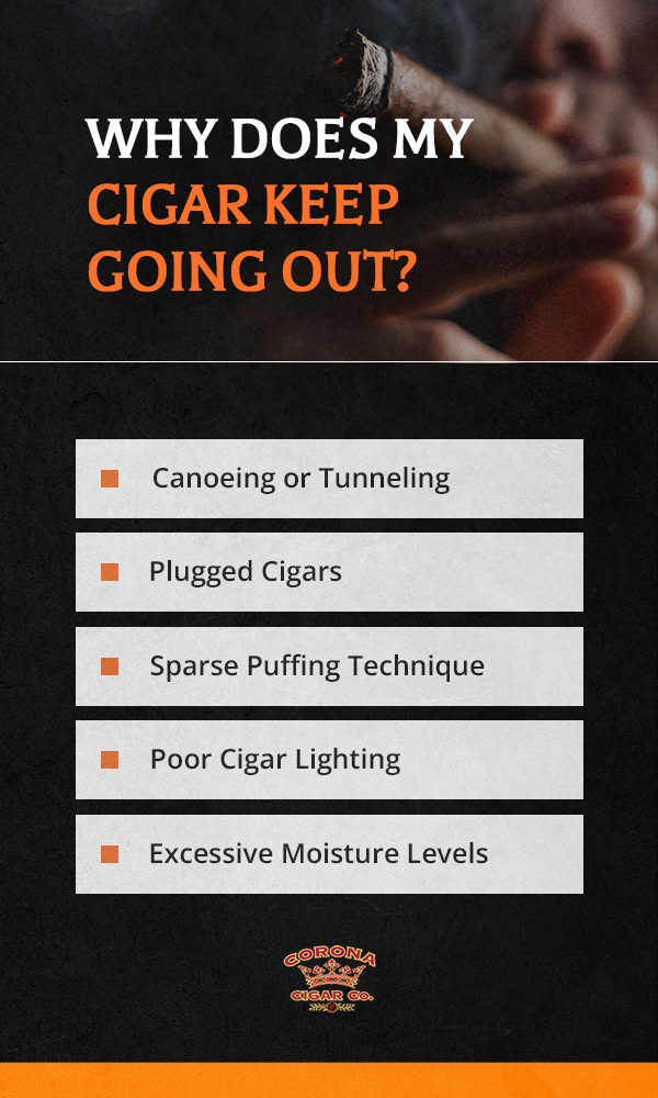 Canoeing and tunneling are common culprits, as the binder, filler and wrapper tobaccos combust at different rates. An easy solution is to use a butane torch lighter. Lighting areas that keep going unlit usually solves the problem. However, if your cigar still keeps going out even after relighting, this indicates an issue with its construction.