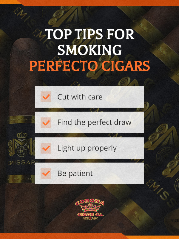 - Cut with care: Aim to cut only 1/8 of an inch or so off your perfecto cigar. Cutting any further down the tapered head of a perfecto can cause the cigar wrapper to become undone. Having a tight draw with a concentrated burst of flavor is the intended way to smoke these superior cigars.